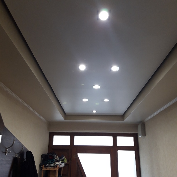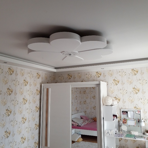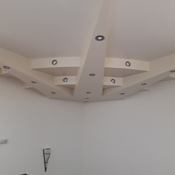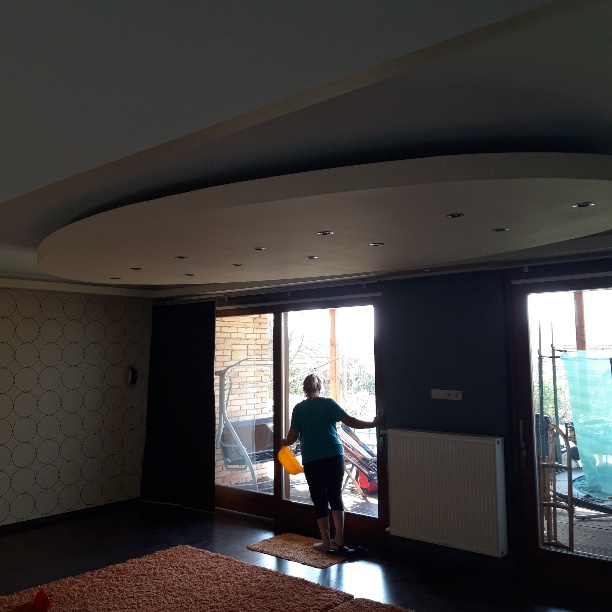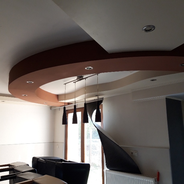 Ennél a munkánál a megrendelőnek az volt a kérése, hogy a normál gipszkarton álmennyezeten túl minden helyiségben legyen a mennyezeten valamilyen díszítőelem is. Így került a nappali mennyezetére pl. egy kb. 5 méter hosszúságú, ellipszis alakú lengő mennyezet, vagy a kislány szobájában egy virág forma, a konyha-étkező mennyezetén egy több alakzatot vegyítő elem, az előszobában süllyesztett mennyezet spot lámpákkal.