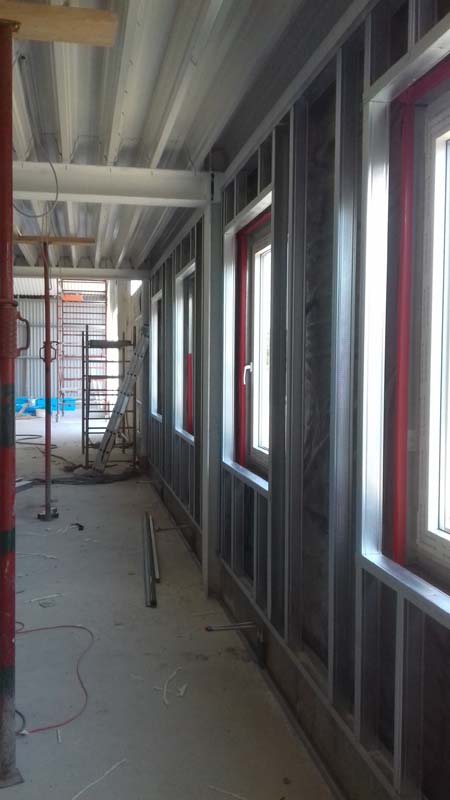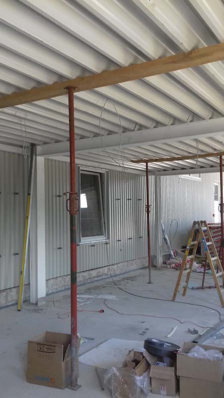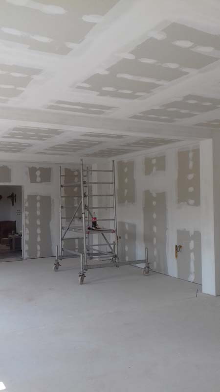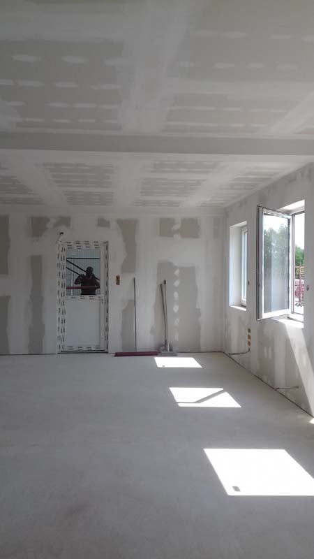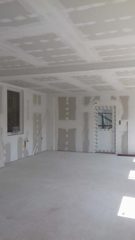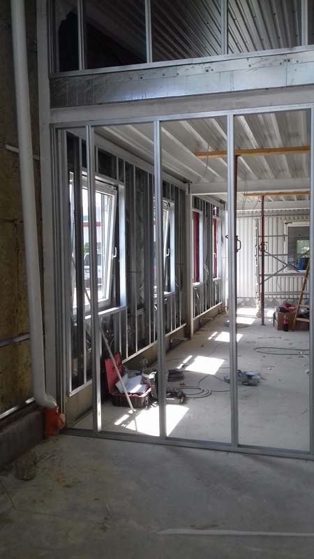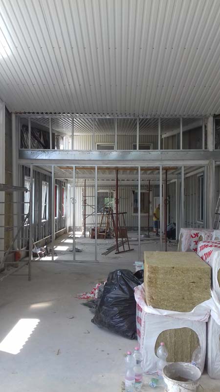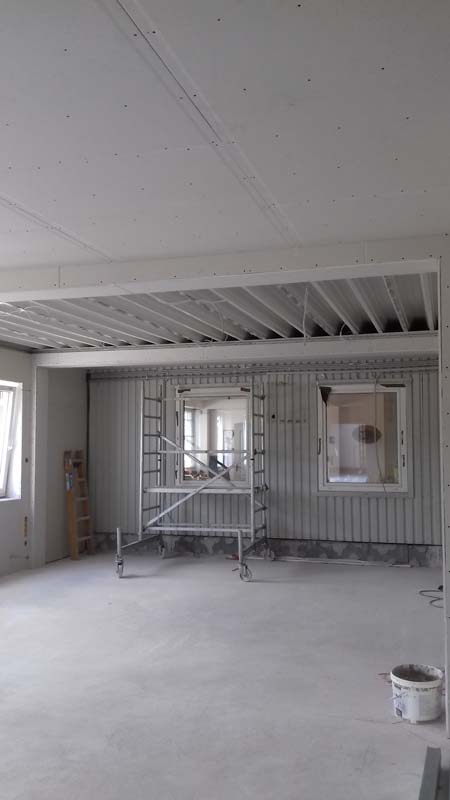 A Multipack Kft. egy csomagoló- és töltőgépek gyártásával foglalkozó cég. Az üzem bővítése során a kibővített csarnok egy részének leválasztásával egy nagy méretű irodát alakítottak ki. A csarnok falai gipszkarton előtétfal-burkolatot kaptak, majd megtörtént a gipszkarton mennyezet megépítése is, a tartó gerendák eldobozolásával.